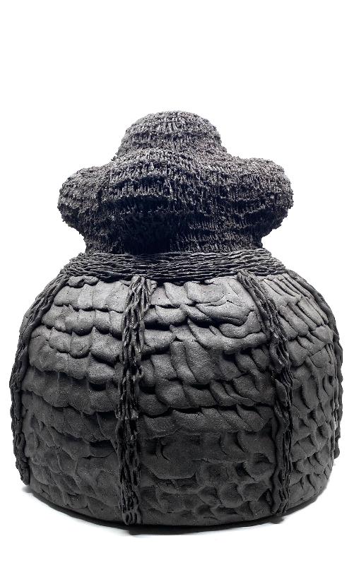 Influenced by hip-hop culture and science fiction, Hayes uses clay as both material and metaphor, building forms that are inscribed with thousands of etched lines made by a needle tool. These marks accumulate into patterns that echo hair, raffia, scars, and inscriptions. The repetitive textures and incised patterns become meditations on memory, ritual, and renewal. The unglazed ceramic surfaces are an unobstructed record of his mark-making, a way for him to imbue each sculpture with his own presence and memories using a material capable of spanning generations. These "cosmic artifacts" serve as conduits for reflection and transformation, transporting the viewer to a quieter frame of mind where they can slow down and take a deeper look at the world around them.